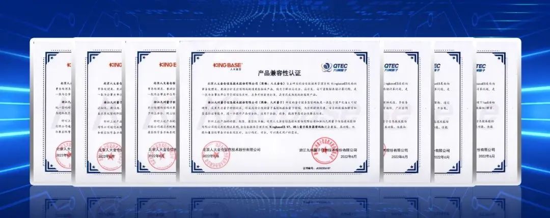 近日,人大金仓主流数据产品KingbaseESV7、V8与九州量子服务器密码机、服务器密码机等7款产品完成兼容性互认证。本次兼容性互认证经人大金仓与九州量子联合测试得出:产品相互兼容,系统功能运行稳定,产品体验良好,满足用户安全性、可靠性及关键业务应用场景的需求。