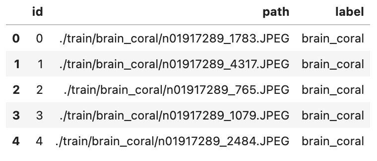 解压后会发现有一个 CSV 格式的文件,它包含了训练集中 1000 张图片的基础信息,如图像的 id、所在路径、以及类别。