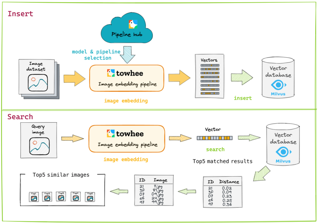 如图 5 所示,我们将以图搜图服务分为插入和查询两步:首先在 Towhee hub 上选择所需的图像 Embedding 流水线,用来提取图像数据集的特征向量,再将特征向量存入 Milvus 中;查询的时候利用同样的流水线提取查询图像的特征向量,然后在 Milvus 中检索得出相似的结果,最终展示出图片。