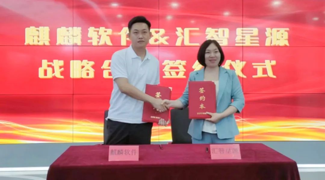 麒麟软件副总裁全龙(左)和汇智星源联合创始人兼副总经理张艳丽(右)签署战略合作协议