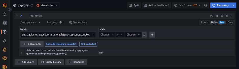 新的可视化构建器还提供了称为“hints”的建议,这些建议会建议正确的操作,针对正在考虑的指标进行自定义,并具有常见但困难的操作,例如绘制直方图。