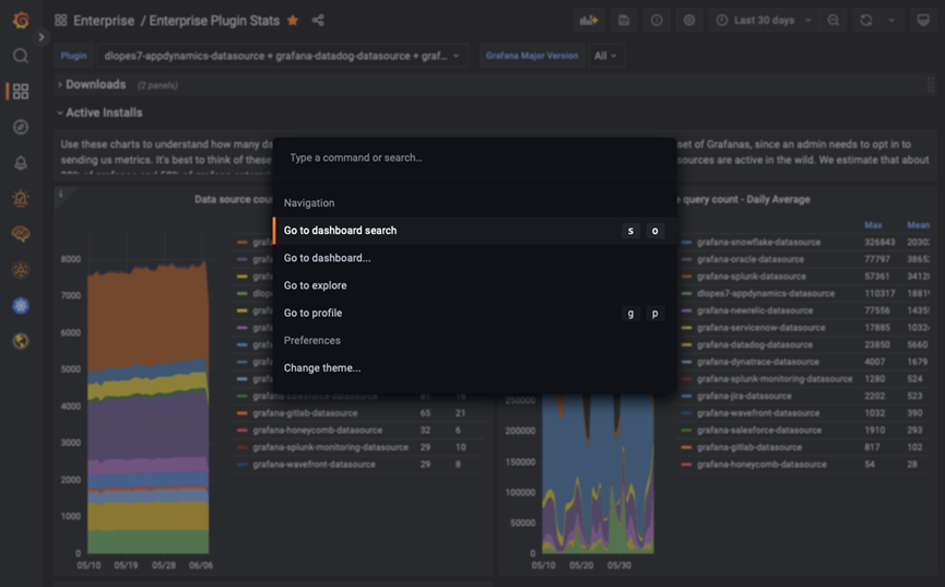 命令面板对于那些常用键盘快捷键的用户来说是一次很大的生产力提升。使用 cmd+K(macOS)或 ctrl+K(Linux/Windows),你可以调出一个命令面板,使导航和仪表盘搜索更加容易。根据你在 Grafana 用户界面中的位置,你可以快速运行一个查询、切换到分割视图、在仪表盘之间导航,或改变主题偏好。