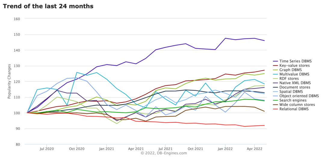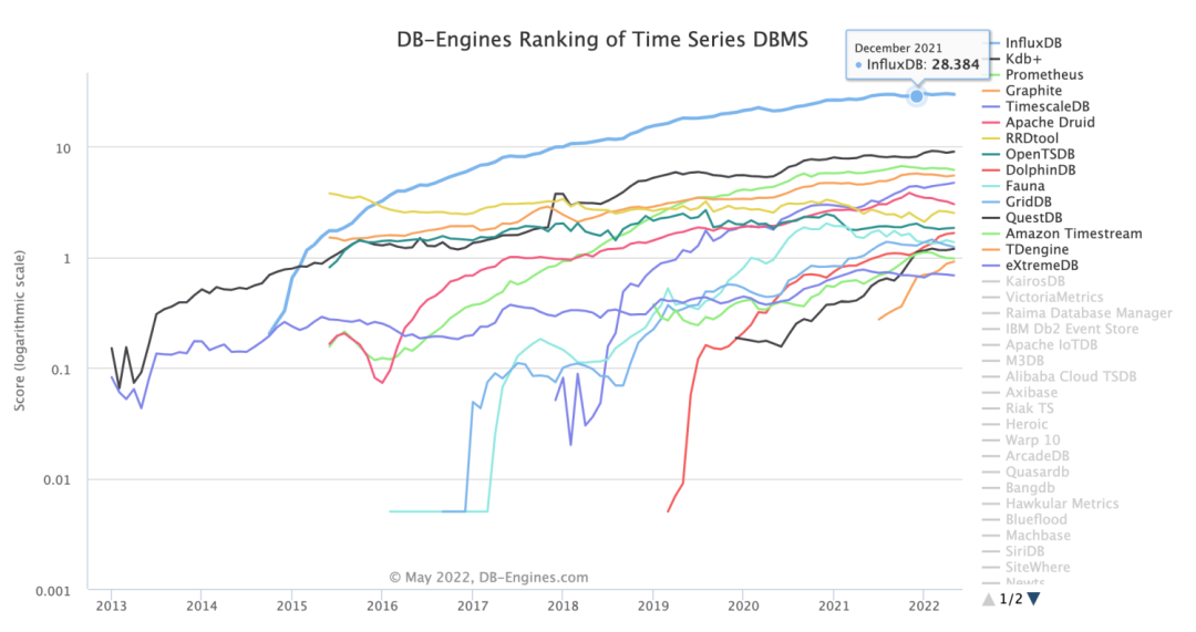 再看时序数据库的排名(上图来自 DB-Engines TimeSeries),热度前三分别是 InfluxDB、Kdb+、Prometheus。