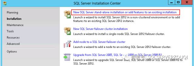 部署AlwaysOn之前,必须搭建WSFC环境;在Windows集群的结点上,推荐安装SQL Server单机实例,AlwaysOn仅要求所有的SQL Server实例都运行在同一个Windows集群环境中,但SQL Server实例本身不需要是集群模式的,推荐安装SQL Server单机实例。在SQL Server安装中心中,选择“全新SQL Server独立安装或向现有安装添加功能(New SQL Server stand-alone installation or add features to an existing installation)”。