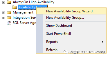 2,使用SSMS连接任意主副本的SQL Server实例,打开新建AG向导(New Availability Group Wizard)