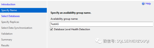3,指定AG的名字,勾选“Database Level Health Detection”选项