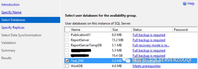 从数据库列表中需要添加到可用性组中的数据,这些数据库将成为一个整体一起发生故障转移,本例勾选Test_DW。
