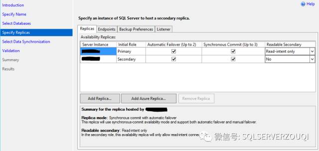 使用“Add Replica”添加可用性副本,在Availability Replicas列表中,能够查看各个可用性副本的配置:
