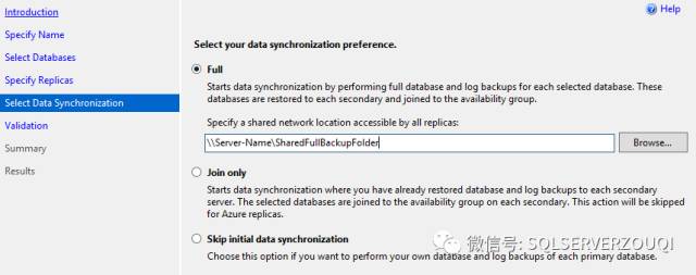 FULL:向导自动对主数据库做完整备份和日志备份,并将备份文件存放在共享目录中,其他副本通过共享目录获得数据库的备份,并在各自的SQL Server实例上还原数据库。通过FULL初始化方式,必须确保主副本上的存储主数据库文件的路径在辅助副本上也存在,即数据库文件的存储路径一致。