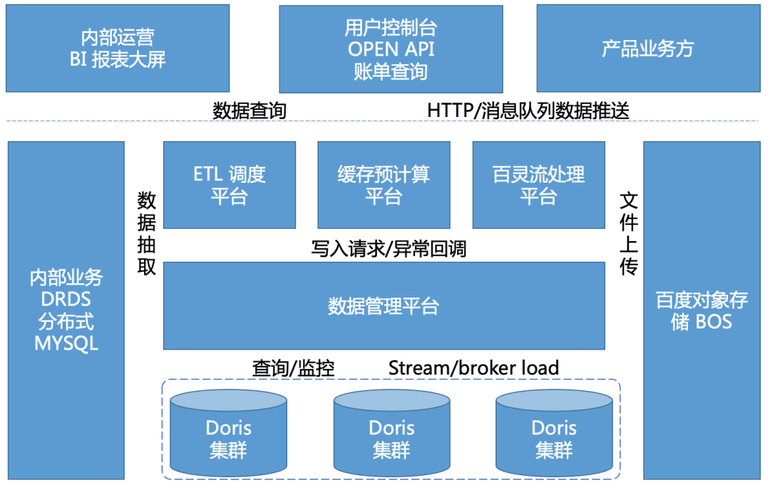 ETL 调度平台主要负责将 DRDS (分布式 MYSQL 集群)等多个数据源中的业务数据按照既定的计算规则导入到 Doris,使用的百度内部通用平台技术,此处不展开来讲。