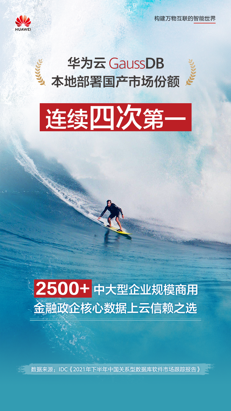 近日,IDC发布了最新的《2021年下半年中国关系型数据库软件市场跟踪报告》。报告显示,在本地部署模式市场中,华为云GaussDB以12%的市场份额排名国内第一,这也是自2020H1至今,GaussDB连续四次斩获第一。