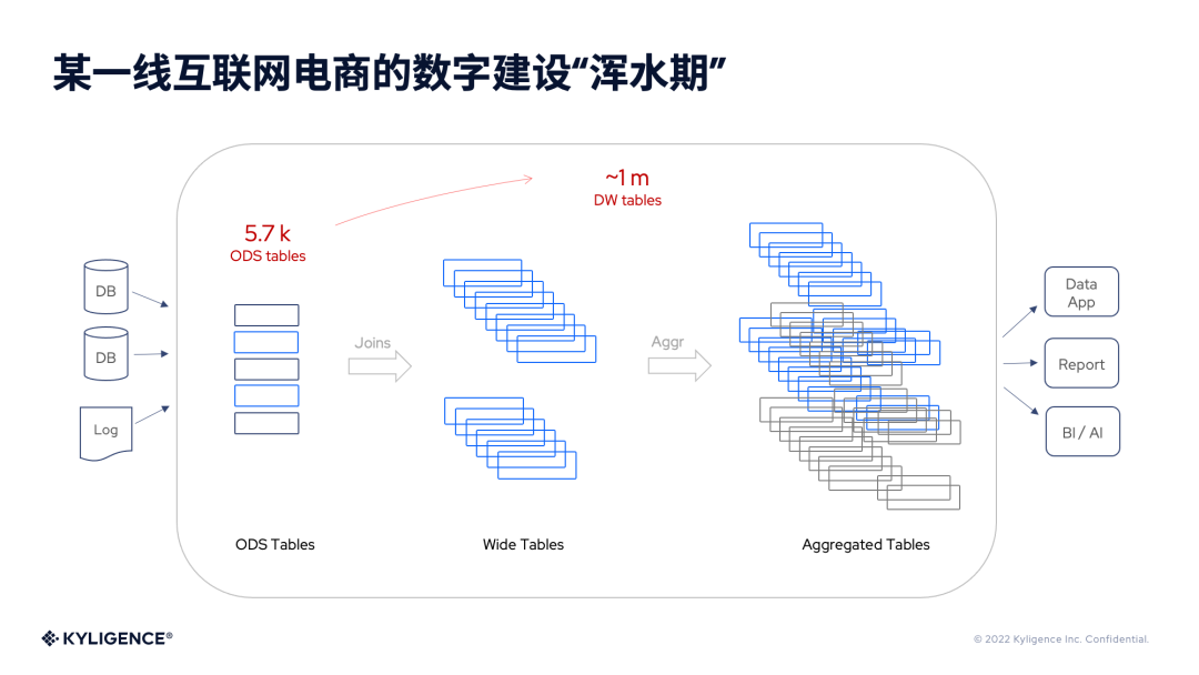这里举 Kyligence 服务的一线互联网电商企业作为例子,这家企业在 2019 年开始搭建自己的数字分析平台,正式进入数字化转型的阶段。其所有数据要通过数据库,落到数据湖,下游是各种数据产品、报表以及 BI、AI 的应用等,用户从数据湖中分析数据,使用一段时间就会发现数据湖逐渐进入“浑水期”。