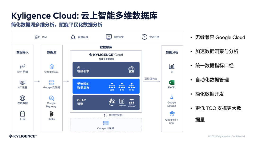 Kyligence 以 Apache Kylin 为核心,融合了 ClickHouse 等技术,来支撑数据分析中高性能和高并发的场景。同时,Kyligence 的 AI 增强引擎,可以根据查询模式的变化,自动优化数据模型,一方面节约成本,另一方面优化性能。Kyligence Cloud 支持无缝兼容 Google Cloud,只要数据在 Google Cloud 上就可以直接使用,从而加速数据洞察和分析的过程。
