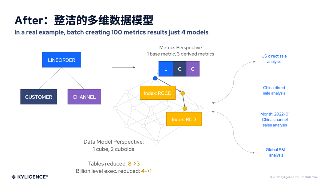 因为多维数据模型的存在,每个模型内部会统一存储所有数据的指标,统一数据指标口径的管理,自动化和简化数据开发的过程。同时,Kyligence 的 OLAP 引擎可以针对大数据量进行优化,企业能以更低的 TCO 来支撑更大的数据量。