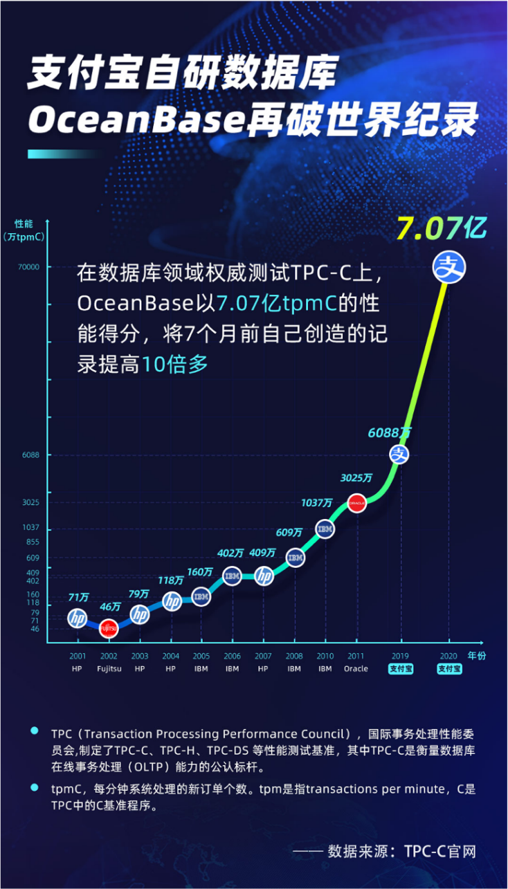 先是在五月,数据库领域最权威的国际机构国际事务处理性能委员会 TPC 在官网发表了最新的 TPC-C 基准测试结果, OceanBase 以 7.07 亿 tpmC 的在线事务处理性能,打破了自己在 2019 年创造的世界纪录,在国内数据库领域可以说是赚足了眼球。