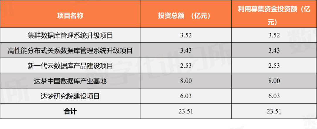 本次发行并上市的募集资金扣除发行费用后,将投资于以下项目:集群数据库管理系统升级项目、高性能分布式关系数据库管理系统升级项目、新一代云数据库产品建设项目、达梦中国数据库产业基地、达梦研究院建设项目,共投资23.51亿元,具体投资金额如下: