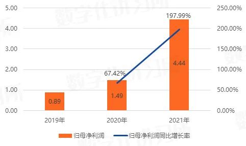 达梦数据招股书显示,在2019年到2021年间,公司营收持续呈现高速增长趋势,2021年营收超过2019年营收的两倍,达到7.43亿元。归母净利润近三年保持高速增长,分别为0.89亿元、1.49亿元和4.44亿元,2021年度增长率高达197.99%。在公司总营收中,核心技术产品收入占比持续超过97%。
