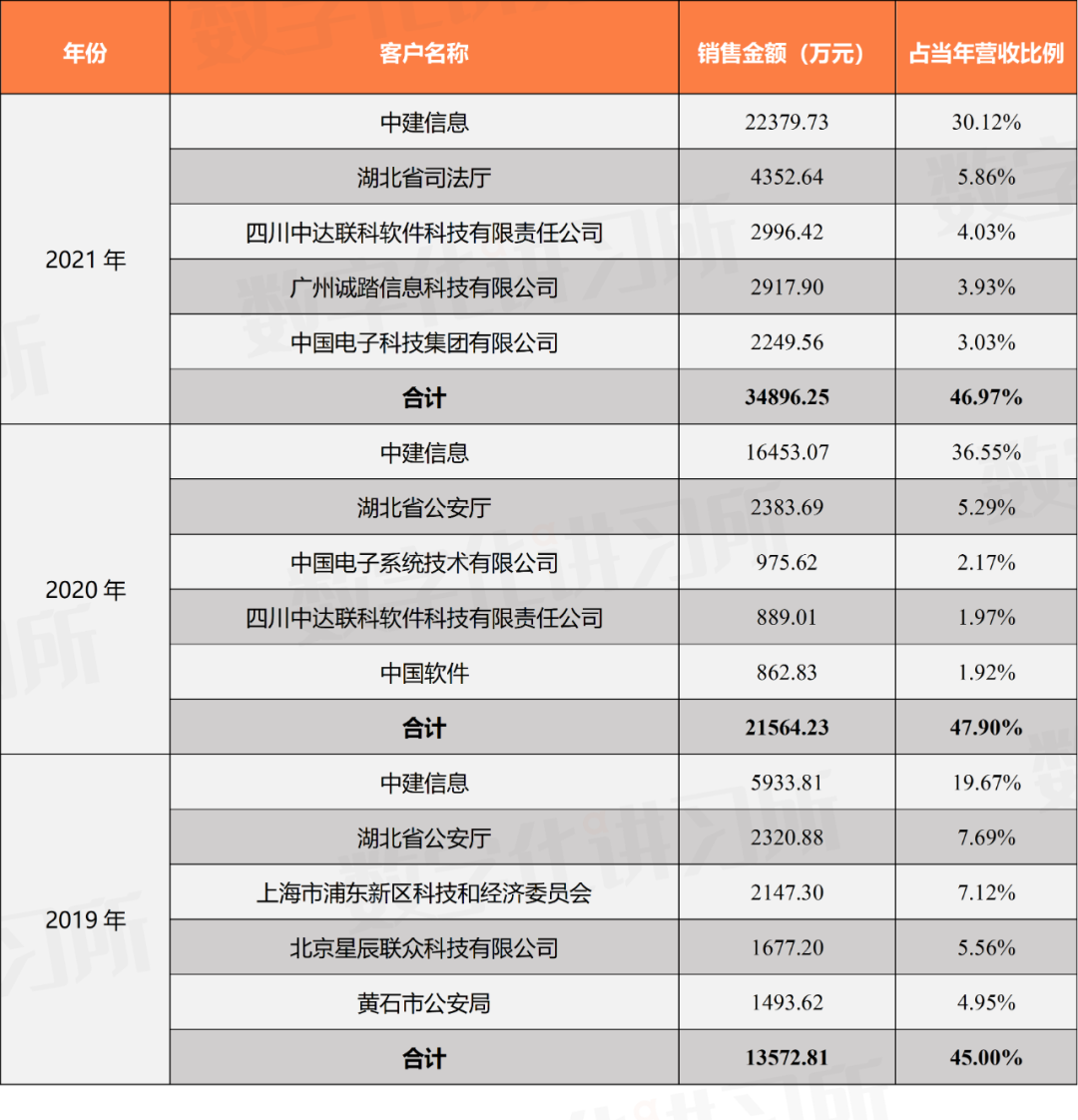 达梦数据服务于包括建设银行、交通银行、光大银行、兴业银行、广发银行、国开行、中国人寿、邮储银行、中国人保、国家电网、中国航信、中国移动、中国烟草、国家市场监督管理总局、各级人民检察院、各级人民法院、国家发改委、国家移民局、证监会、上交所、深交所等在内的知名用户,成功应用于金融、能源、航空、通信、党政机关等数十个领域。根据达梦数据招股书,2019年至2021年间达梦数据前五大客户除中建信息一直保持首位外其他客户均有变动,系数据库类产品单个企业/政府部分需求数量较少,使用周期较长,客户短期内不会重复购买的原因。公司向单个客户当期销售额均未超过当期销售总额的50%,不存在严重依赖少数客户的情况。