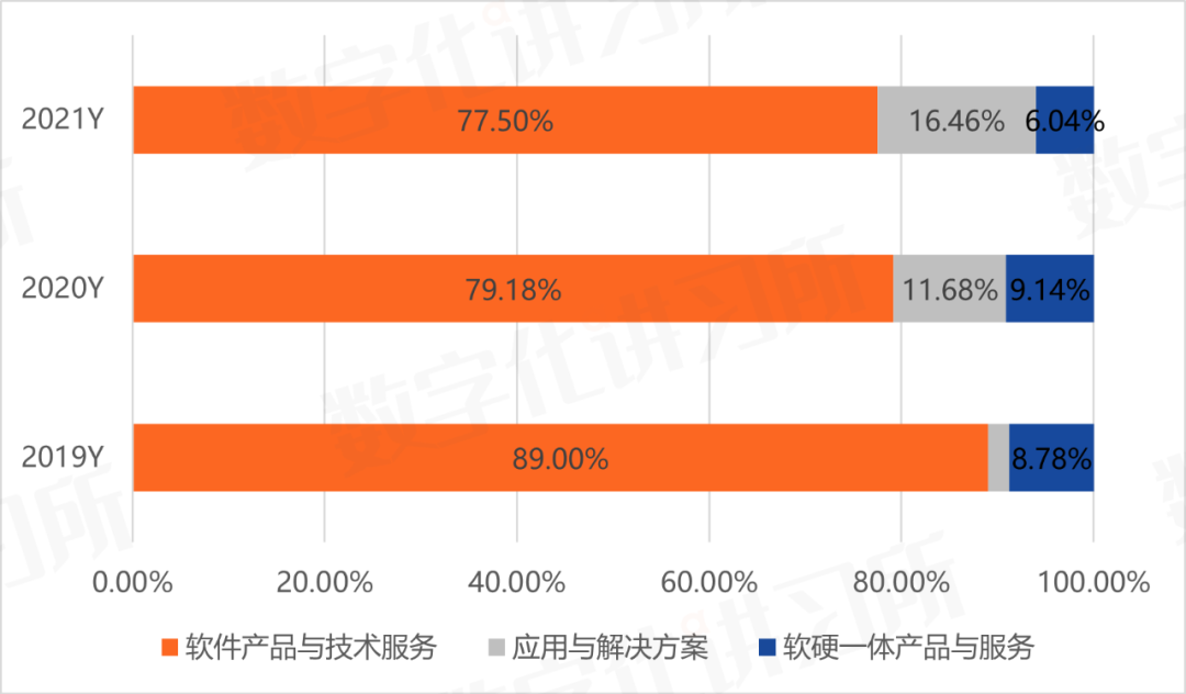 从产品构成来看,软件产品与技术服务的毛利率分别为64.35%、66.33%及71.83%,高于公司的综合毛利率,整体趋势稳中有升;软件应用与解决方案业务的毛利率分别为-30.22%、5.39%及0.21%,2020年其毛利额扭亏为正,但毛利率仍处于较低水平,系业务发展初期大量人力及资源开拓投入所致;软硬一体产品及服务毛利率分别为46.61%、53.29%及53.50%。毛利率持续增长,系公司搭载销售的软件产品及配套服务占比提升所致。