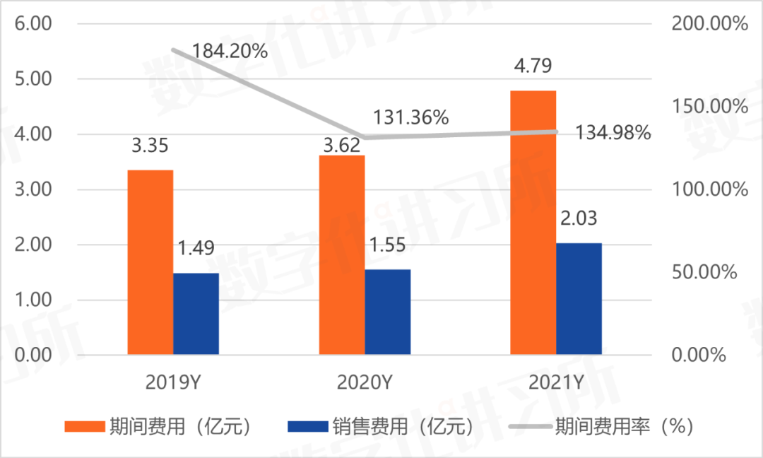 根据招股说明书,2019年至2021年星环科技的期间费用率(剔除股份支付)分别为192.06%、139.47%及144.82%,即期间费用超过了营业收入,导致公司业绩不佳。在三项期间费用中,销售费用的支出占比最高,2019年至2021年销售费用分别为1.49亿元、1.55亿元及2.03亿元,占当期营业收入的比例分别85.59%、59.75%及61.42%。