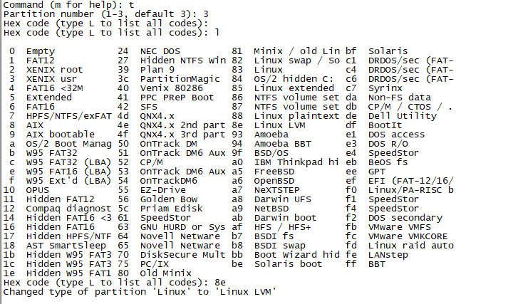 分区号用默认 3(或回车),Hex代码输入:8e (代表适用Linux LVM分区类型)