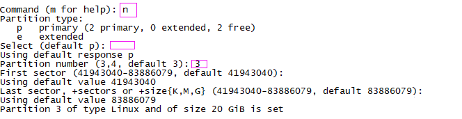 2) 输入n新增分区,直接回车,默认为主分区(primary);