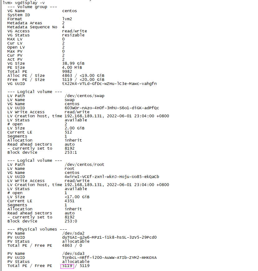 #将系统盘/dev/mapper/centos-root与sda3的5119空余容量合并,输入如下命令: