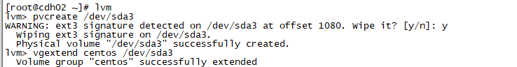 #将新分区添加进系统默认的Volume group,centOS的默认Volume group为centos