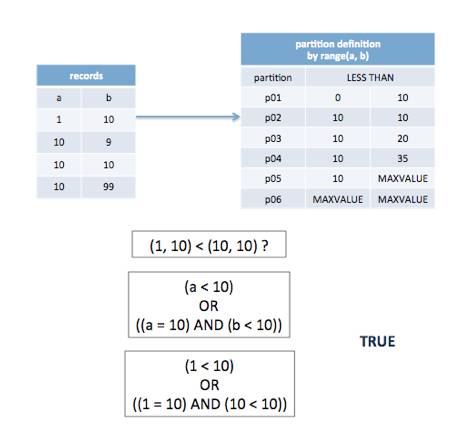 其实,RANGE Columns分区键的比较(元组的比较)其实就是多列排序,先根据a字段排序再根据b字段排序,根据排序结果来分区存放数据。和RANGE单字段分区排序的规则实际上是一致的。