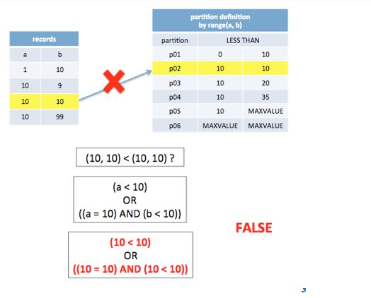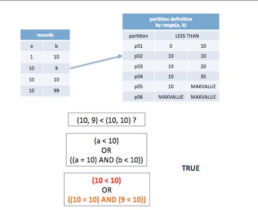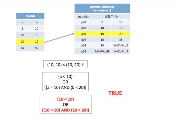 写入a=10, b=9的记录,从information_schema.partitions 表能够发现数据实际上写入了p02分区,也就是说元组 (10, 9) < (10, 10),元组(10, 9)的大小判断不是简单的通过元组的首字段进行的: