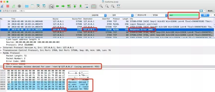 用Wireshark打开pcap包,搜索密码错误报错的关键字"denied",可以找到数据库给应用返回报错的数据包。