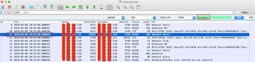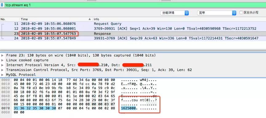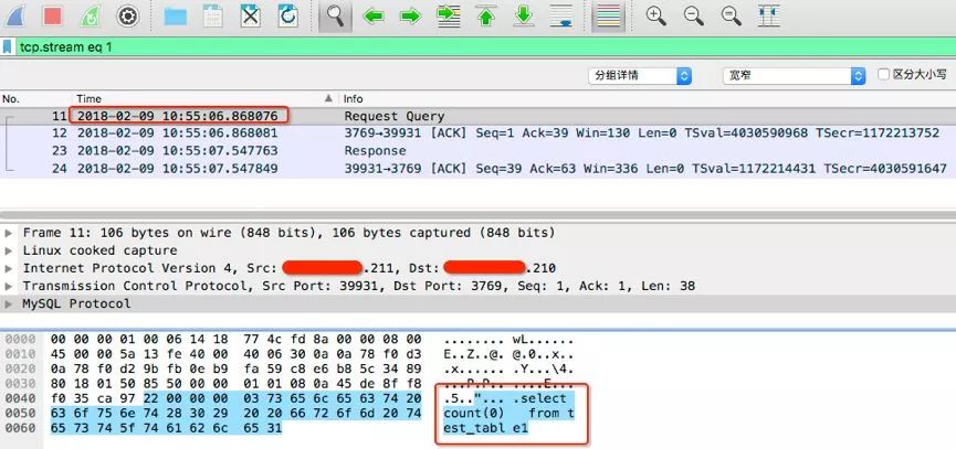 这条记录是211的应用机器给数据库发的执行sql,发送时间是2018-02-09 10:55:06 868076,右下角可以大概看到是我们执行的sql语句。