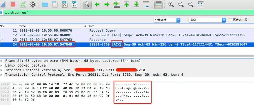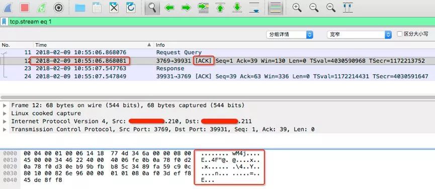 这条记录是数据库210收到sql后,给应用主机211发的确认ACK,表明已收到sql,发送时间是2018-02-09 10:55:06 868081。右下角是一堆类似乱码的字符。