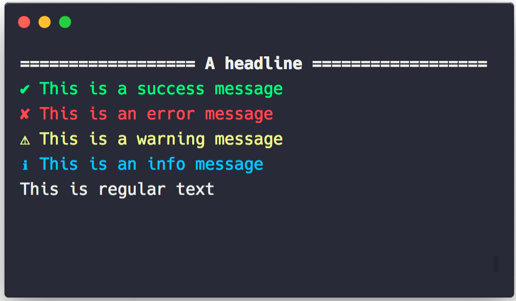 from wasabi import Printermsg = Printer()msg.divider("A headline")msg.good("This is a success message")msg.fail("This is a error message")msg.warn("This is a warning message")msg.info("This is a info message")print("This is a regular text")