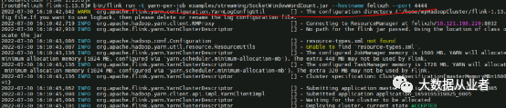 nc -l 4444[root@felixzh flink-1.13.6]# bin/flink run -t yarn-per-job examples/streaming/SocketWindowWordCount.jar --hostname felixzh --port 4444