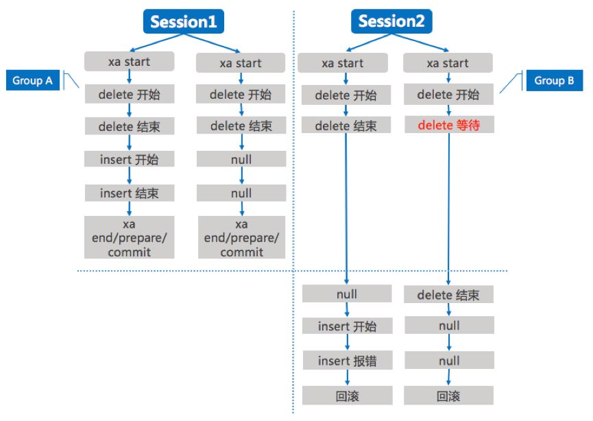 流程图每一行代表一个时间点,每个session左边列代表groupA节点操作,右边列代表groupB节点操作。null代表无操作。