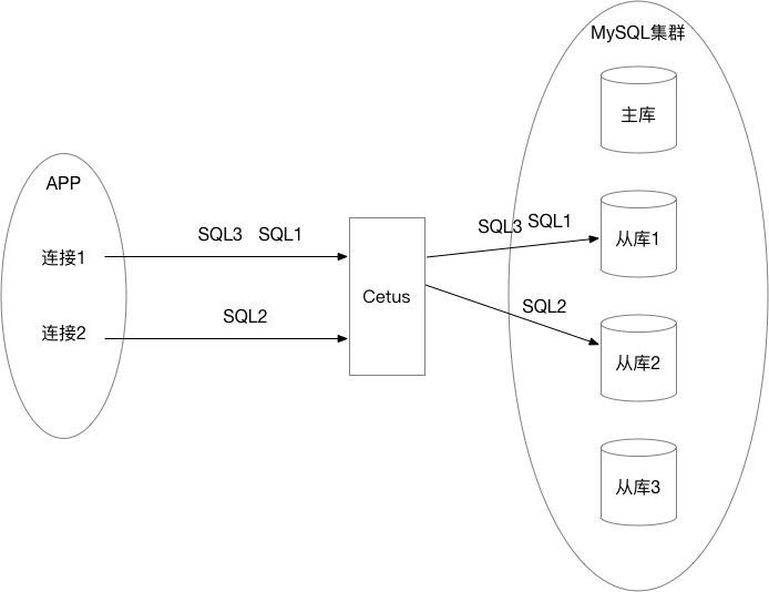 在流量分配方面,Cetus也进行了优化。一些MySQL数据库中间件(例如Atlas)是基于SQL的维度做负载均衡的,即不会考虑SQL是否是同一个连接还是不同连接发送来的,中间件依次将接收到的SQL按照策略发往后端的数据库。