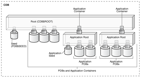 在12cR2版本中Oracle带来新的Application Containers特性,该特性对原有的多租户功能进行了增强,在CDB root容器中可以创建一个叫做Application root的容器,类似于CDB root,可在其内创建多个依赖于Application root的Application PDBs,其架构图如下: