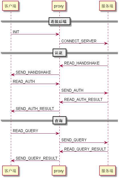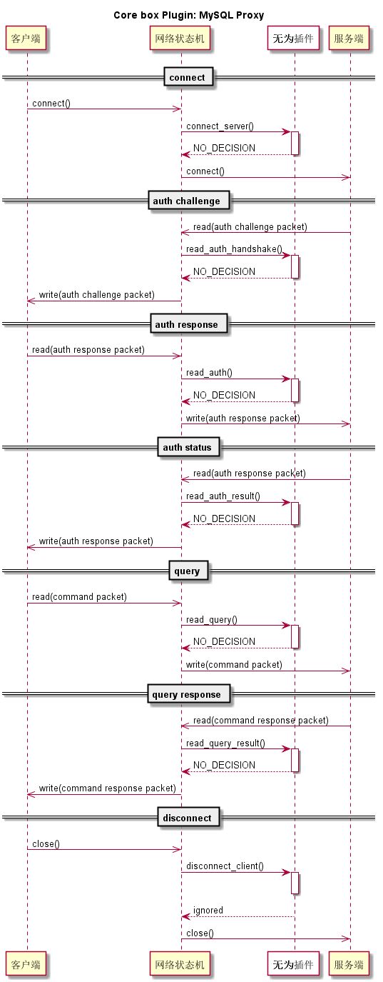 上图显示插件层会话的生命周期,跟随网络状态转移,网络状态机的连接、认证和断开阶段可以看作暂时状态 ,正常运行期间,主循环通常处于query和query response阶段,即SQL和结果集的代理转发阶段。