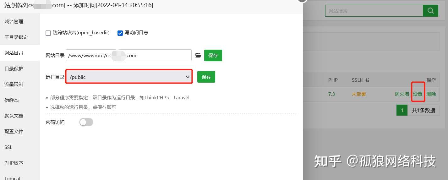 在宝塔侧边栏的“网站”中添加一个站点,把从 GitHub 上面下载的 “免签约”压缩包文件上传到 新添加的站点目录下 并解压。然后在站点“设置”->“网站目录”中把 运行目录 设置为 public 并保存。