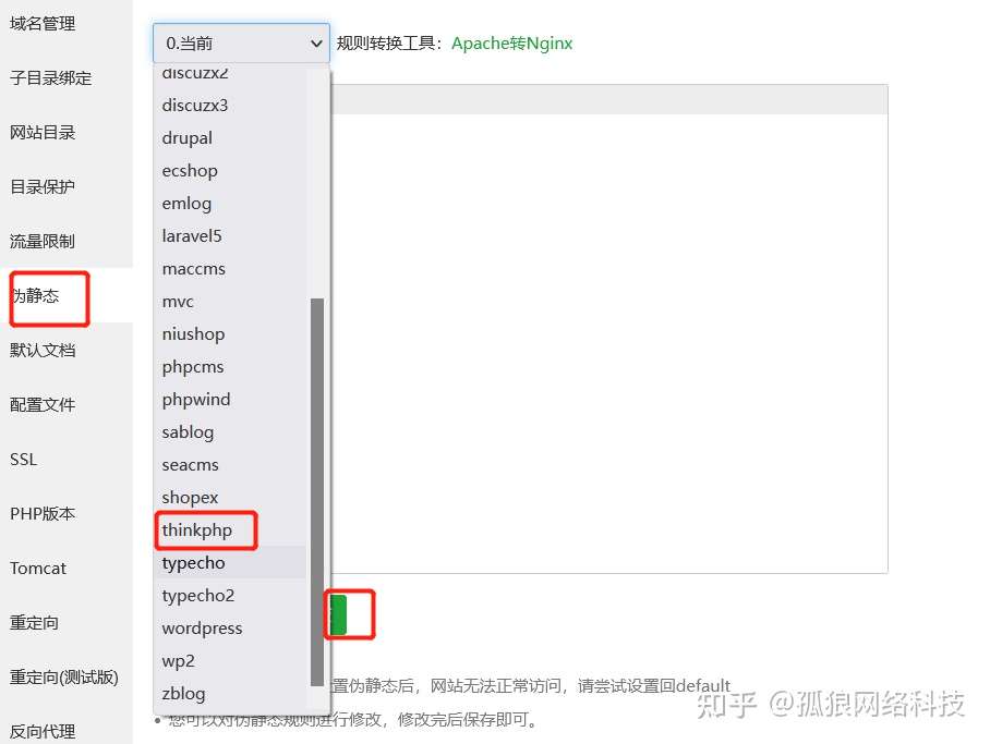 另外还需要配置网站的伪静态,在“伪静态”中的下拉框里面选择 thinkphp 并保存。最后就是设置“默认文档” 把 index.html 放到第一行,这样就基本配置好了 接下来就是需要导入数据库文件了。