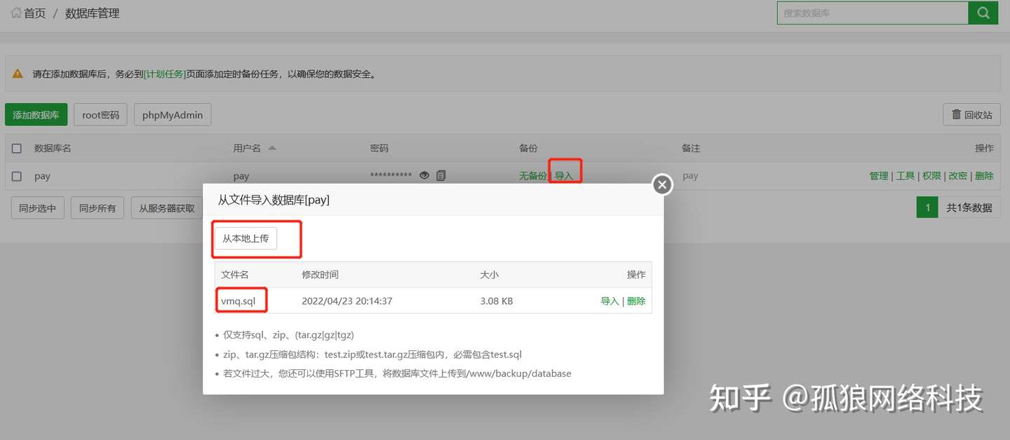 “数据库”用于存储 用户订单 收款码 等网站配置信息 因此需要创建一个数据库,在宝塔中 创建好数据库将 “免签约”压缩包下的 vmq.sql 解压出来 导入到 创建的数据库中。