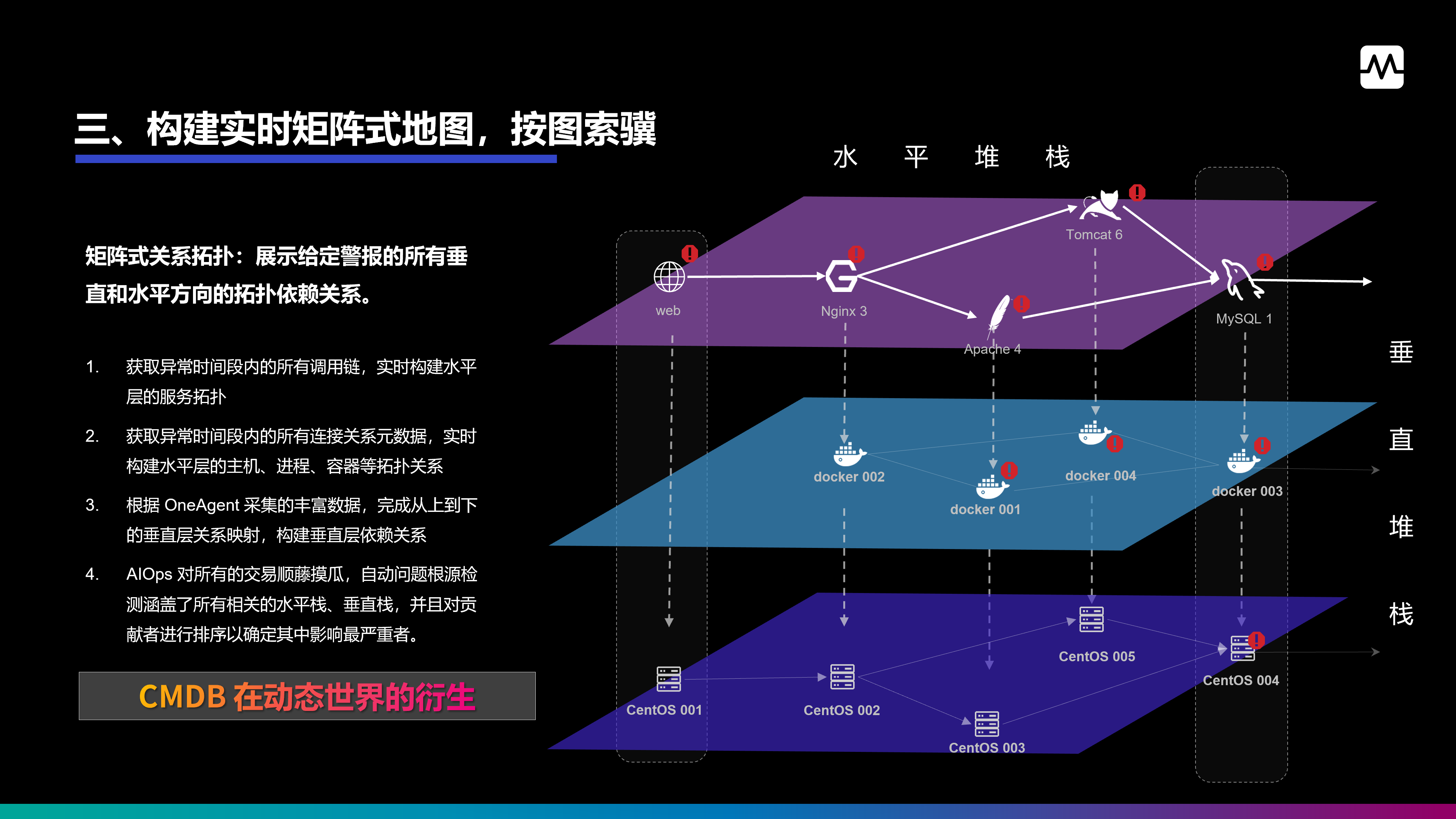 内生AIOps平台能够构建实时矩阵式的拓扑。能够按图索骥,看到图纸当中水平方向,比如服务层的依赖关系图,还有容器层、主机层、进程级等。垂直向则是服务是跑在什么容器上,这个容器对应的是哪一个进程,这个进程是落在哪一个云主机上面。