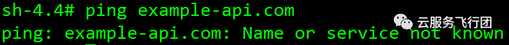 由于客户的应用pod只访问example-api.com这一个外部域名,因此判断应该是pod解析该域名时出现异常。为了进一步验证,我们执行kubectl exec -it example-app bin/sh命令进入pod内执行ping example-api.com命令,果然出现了相同的报错。