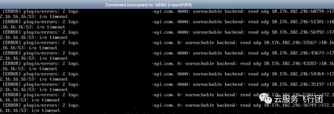 再执行kubectl logs coredns –n kube-system,看到pod日志中有大量和客户配置的外部dns服务器IP地址通讯超时的报错。