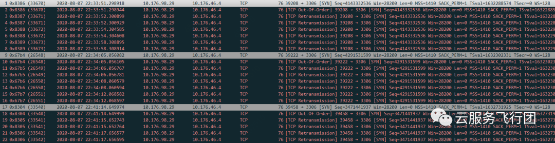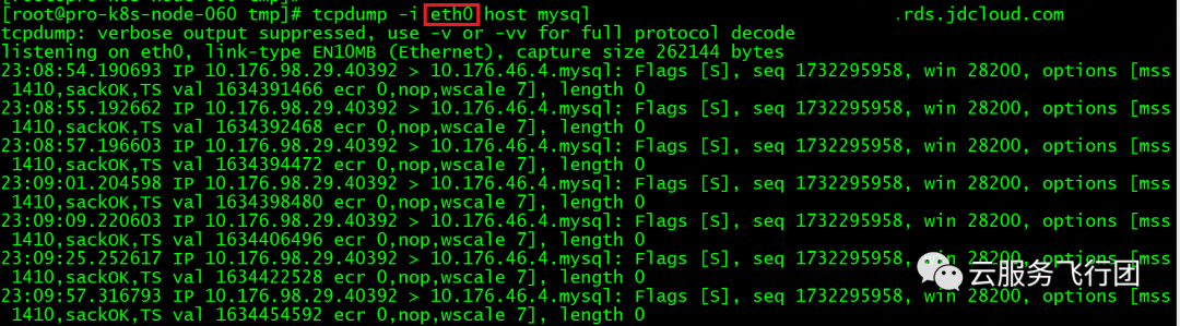 在客户的场景下,应用pod使用所在节点的eth1网卡,所以pod telnet云数据库的3306端口时,我们直接在节点上抓取eth1网卡上与云数据库IP交互的数据包即可。