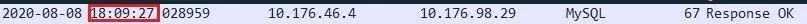要想确认pod和云数据库在处理请求时的时长,还是要依靠tcpdump工具抓包分析。于是我们在pod对数据库发起一次完整的请求过程中,依然使用tcpdump -i eth1 host 10.176.46.4 -w tmp/mysql.cap命令在pod所在节点抓包。将数据包取出后分析发现,一次完整的业务请求,pod会对数据库做13次查询。对比第一次查询和最后一次查询的时间,如图所示: