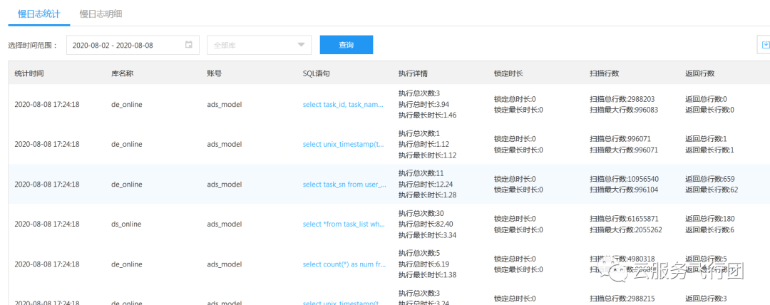 同时实例慢查询日志中有大量慢sql记录,可以看到几乎每次查询都耗时较长