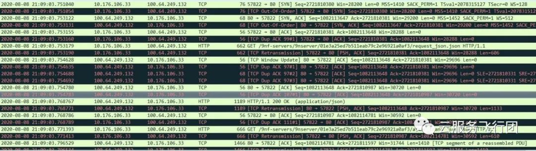 为了完整了解应用pod在应用调用过程中都产生了哪些数据交互,我们决定再次抓包分析,但焦点不再集中在云数据库上,而是以pod维度进行抓包。使用tcpdump -i eth1 host <podIP> -w /tmp/app.cap命令在pod所在节点抓取所有和pod相关的包,分析数据包后果然有了新的发现:pod与100.64.249.132这个地址有文件传输交互。