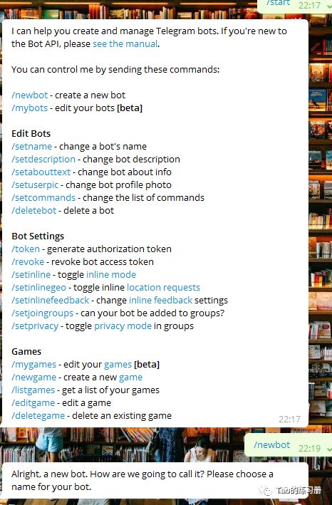 如何创建telegrambot,查看Telegram API 可以发现如果要创建就要找到BotFather申请。